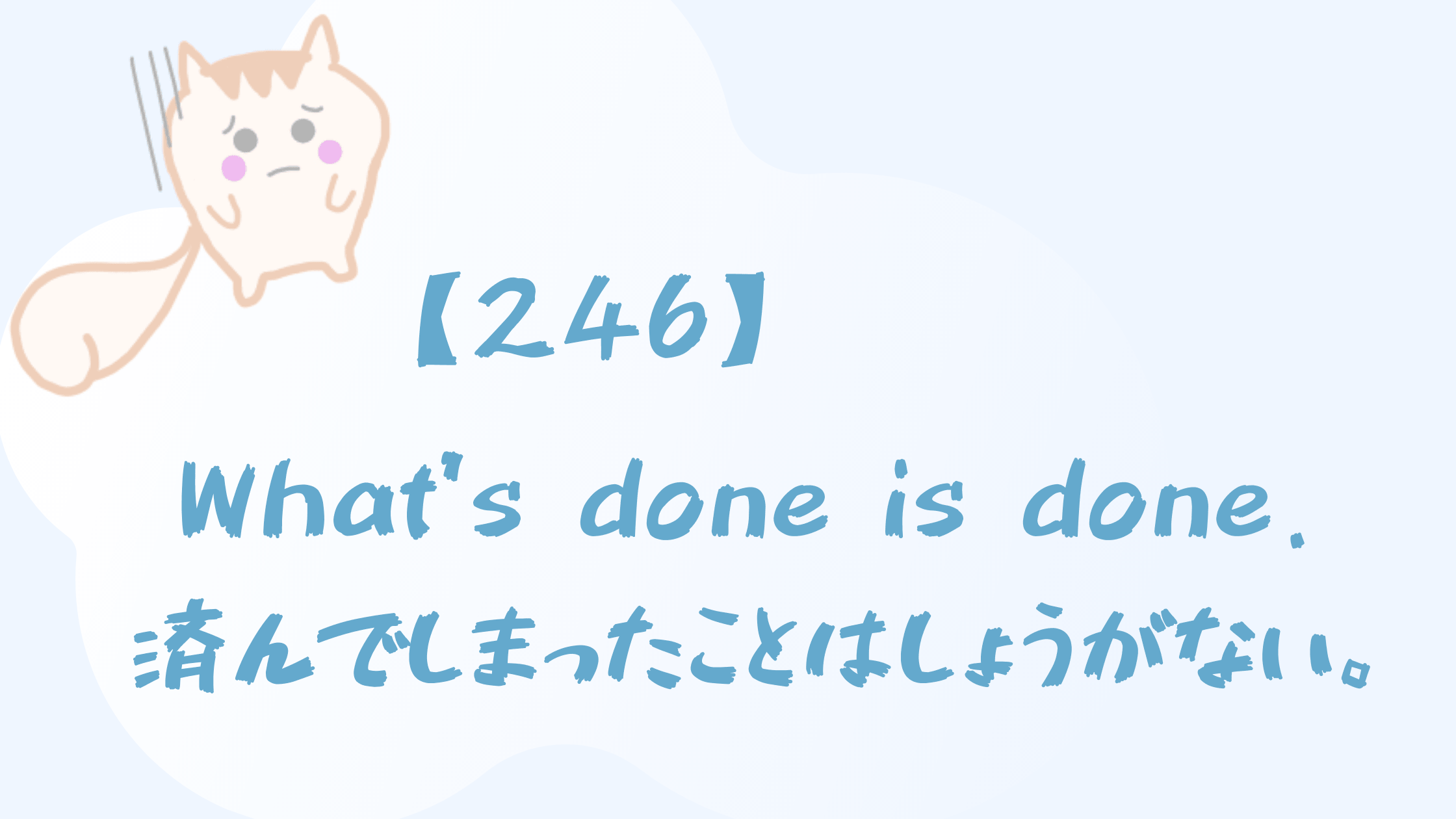 くま先生「What’s done is done」は「起こってしまった(嫌な)ことは過去のこととして受け入れ、それよりもこの先のことを考えよう」という意味合いの前向きな英語表現だよ。