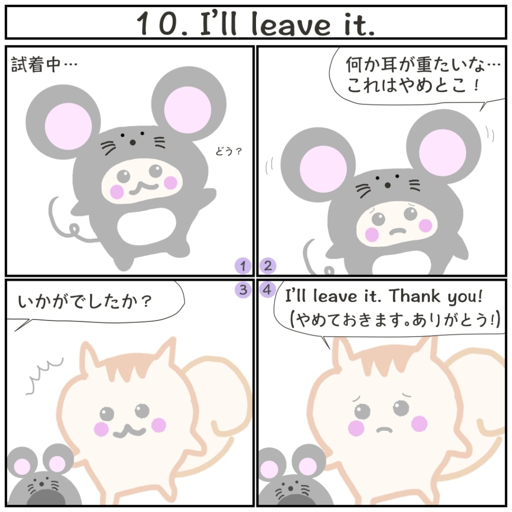 [10]I’ll leave it./やめておきます 2021 1/13 4コマ英語 2021.01.13 2021.01.28 ※当サイトは、アフィリエイト広告を利用しています あわせて読みたい【10】I’ll leave it./やめておきます<今日のフレーズ>I’ll leave it. 4コマ英語 よかったらシェアしてね! URL Copied! URL Copied! 【237】I always suffer from it at this time of year./毎年この時期はそれに苦しみます。 <1>oblivious & obvious 意味と例文 関連記事 [22]Let’s grab a quick bite./軽く食事しよう 2021.01.25 [4]cut 〜 into three pieces/〜を3個に切り分ける 2021.01.06 [7]just in case/念のため 2021.01.10 [17]Let’s take a break./休憩しましょう 2021.01.20 [21]I’ll leave it (up) to you./あなたに任せるよ 2021.01.24 [32]Go easy on the mayo, please./マヨネーズ控えめでお願いします 2021.02.04 [20]It’s pricey./値段が高いです 2021.01.23 [2]Do you take credit cards ? /クレジットカードは使えますか? 2021.01.04