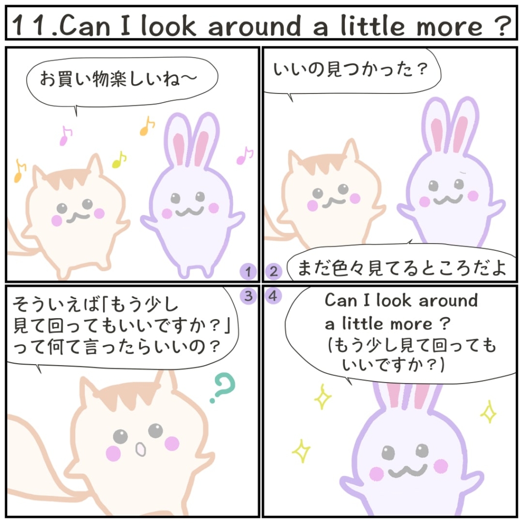 [11]Can I look around a little more ?/もう少し見て回ってもいいですか? 2021 1/14 4コマ英語 2021.01.14 2021.01.28 ※当サイトは、アフィリエイト広告を利用しています あわせて読みたい【11】Can I look around a little more ?/もう少し見て回ってもいいですか?<今日のフレーズ>Can I look around a little more ? 4コマ英語 よかったらシェアしてね! URL Copied! URL Copied! <1>oblivious & obvious 意味と例文 【238】Please go ahead and ~/ 遠慮しないで~してください 関連記事 [4]cut 〜 into three pieces/〜を3個に切り分ける 2021.01.06 [32]Go easy on the mayo, please./マヨネーズ控えめでお願いします 2021.02.04 [22]Let’s grab a quick bite./軽く食事しよう 2021.01.25 [35]Does this come with a salad? /これにサラダはついていますか? 2021.02.07 [38]It’s just your imagination./気のせいだよ 2021.02.11 [20]It’s pricey./値段が高いです 2021.01.23 [24]I should have〜/〜しておけばよかった 2021.01.27 [36]Can I have the dressing on the side?/ドレッシングは別添えでお願いします。 2021.02.08