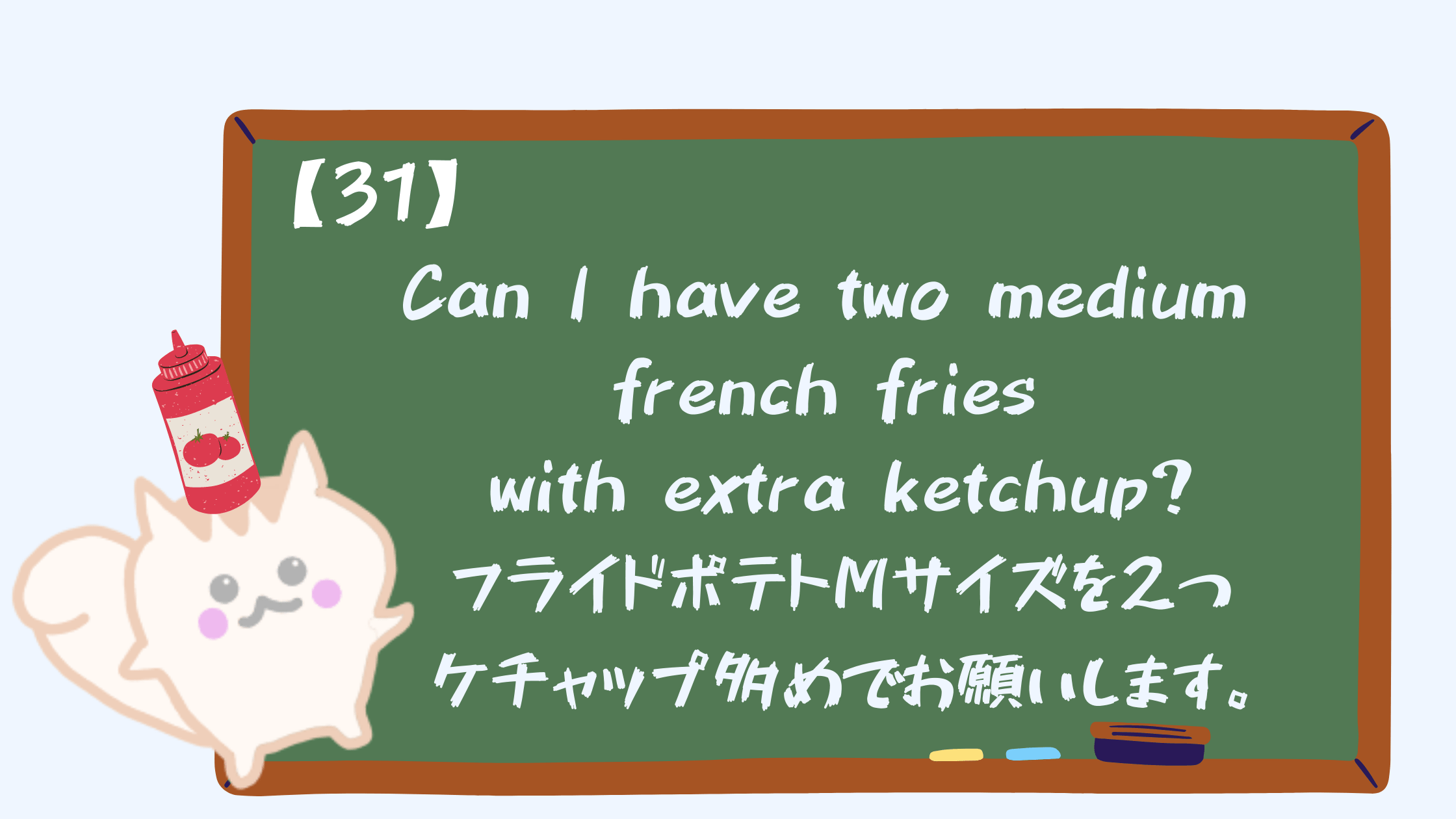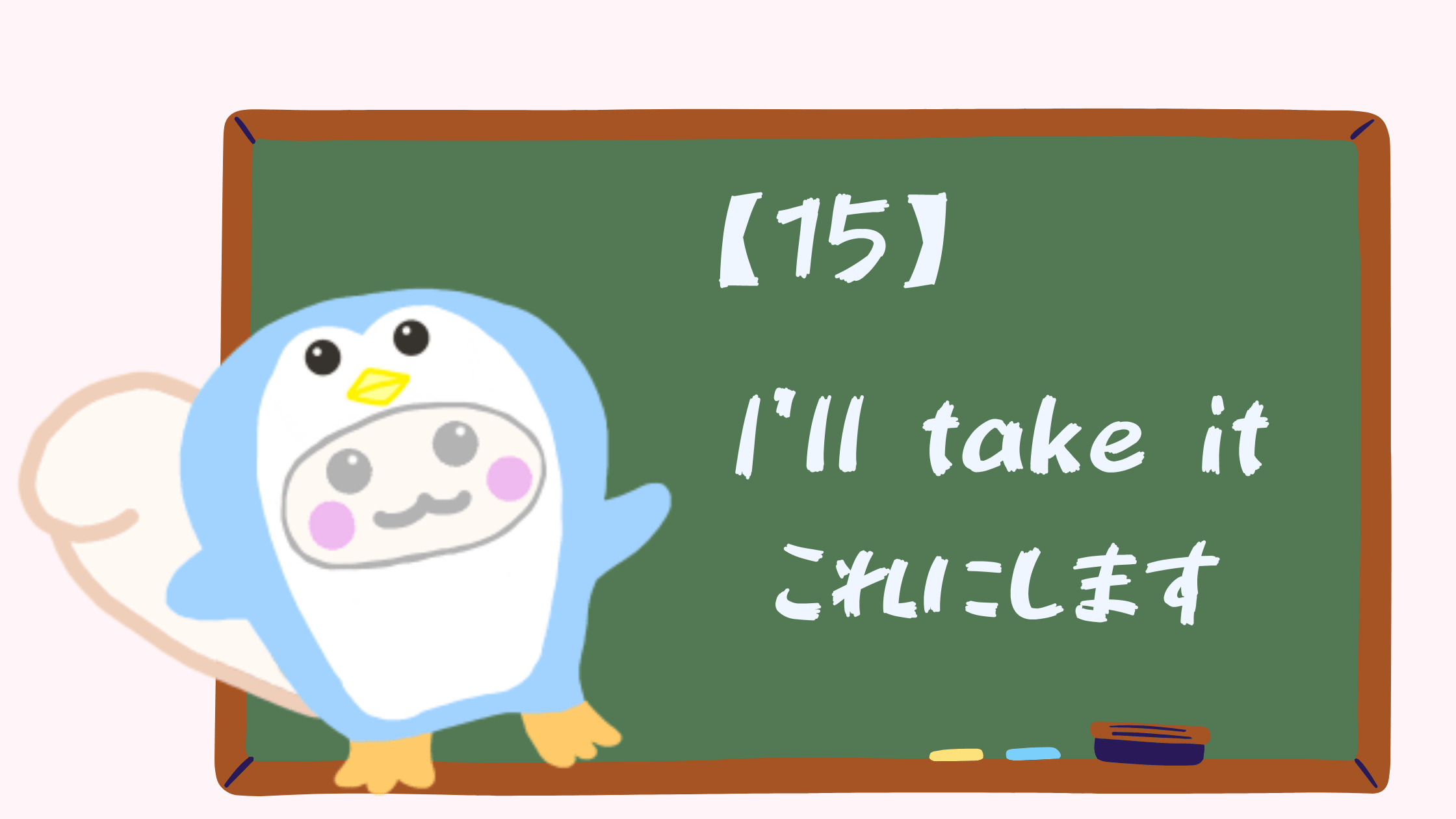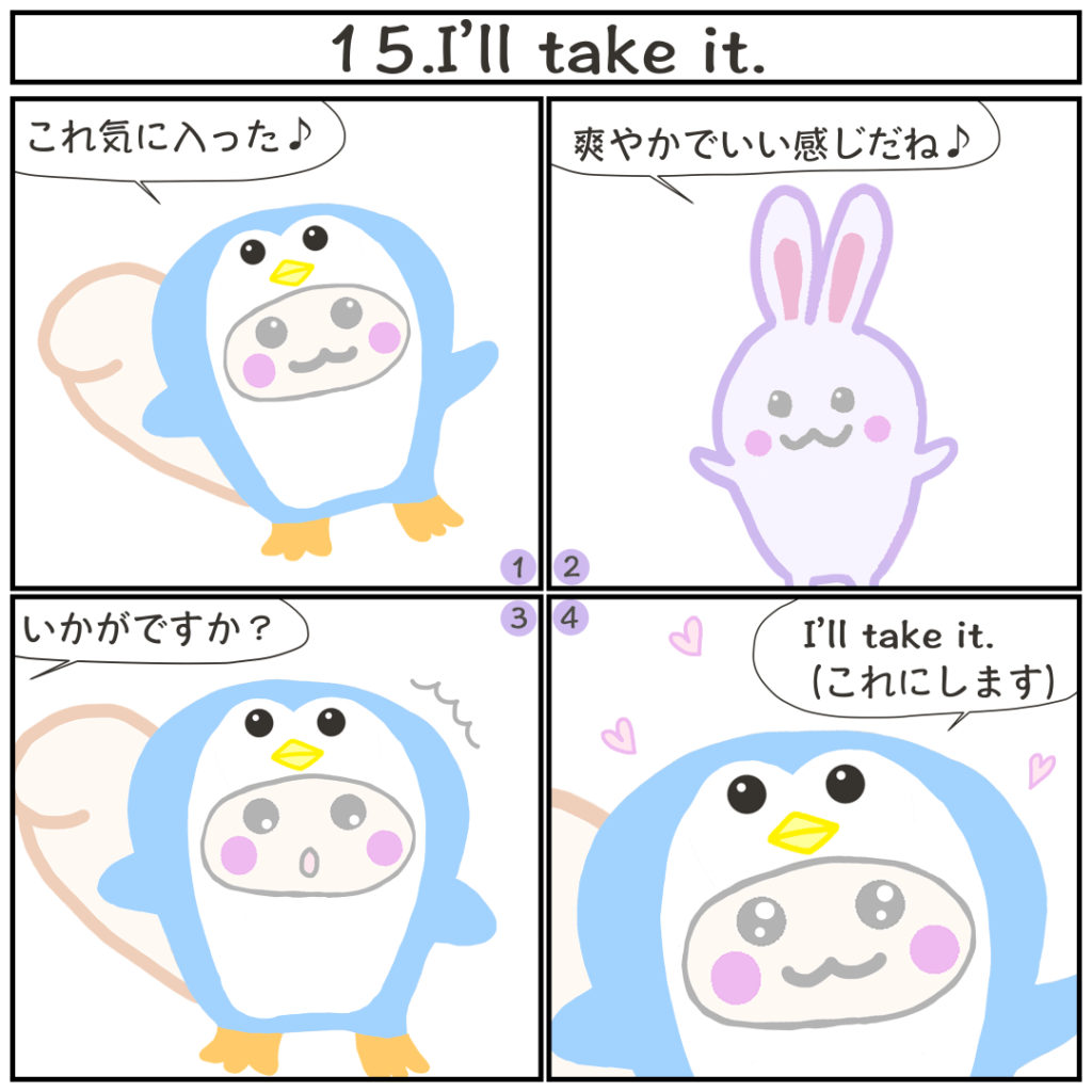 [15]I’ll take it./これにします 2021 1/18 4コマ英語 2021.01.18 2021.01.28 ※当サイトは、アフィリエイト広告を利用しています あわせて読みたい【15】I’ll take it/これにします<今日のフレーズ>I’ll take it. 4コマ英語 よかったらシェアしてね! URL Copied! URL Copied! <5>forfeit & forehead 意味と例文 【240】Throw together some stuff from the fridge/冷蔵庫にあるものでササっと料理を作る 関連記事 [38]It’s just your imagination./気のせいだよ 2021.02.11 [33]I have something great to tell you. /あなたに伝えたいことがあります 2021.02.05 [6]Can I try this on ?/試着してもいいですか? 2021.01.08 [35]Does this come with a salad? /これにサラダはついていますか? 2021.02.07 [25]I have a hangover. / 二日酔いです。 2021.01.28 [21]I’ll leave it (up) to you./あなたに任せるよ 2021.01.24 [14]Do you have this in another color?/他の色はありますか? 2021.01.17 <40>I finally did it./やっと出来た 2021.02.24