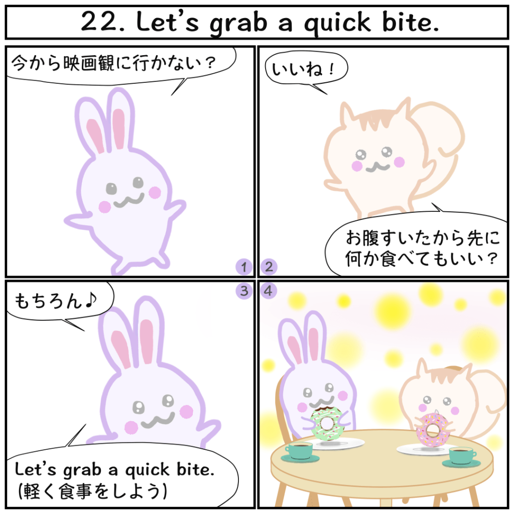 [22]Let’s grab a quick bite./軽く食事しよう 2021 1/25 4コマ英語 2021.01.25 2021.01.28 ※当サイトは、アフィリエイト広告を利用しています あわせて読みたい【22】Let’s grab a quick bite./軽く食事しよう<今日のフレーズ>Let’s grab a quick bite. 4コマ英語 よかったらシェアしてね! URL Copied! URL Copied! <12>frisk 意味と例文 【245】Let's pull over./路肩に車を停めよう。 関連記事 <40>I finally did it./やっと出来た 2021.02.24 [10]I’ll leave it./やめておきます 2021.01.13 [9]I’ll think about it./ちょっと考えてみます 2021.01.12 [19]That’s a steal./激安だね 2021.01.22 [11]Can I look around a little more ?/もう少し見て回ってもいいですか? 2021.01.14 [17]Let’s take a break./休憩しましょう 2021.01.20 [25]I have a hangover. / 二日酔いです。 2021.01.28 [23]It’s no big deal./大したことじゃないよ 2021.01.26