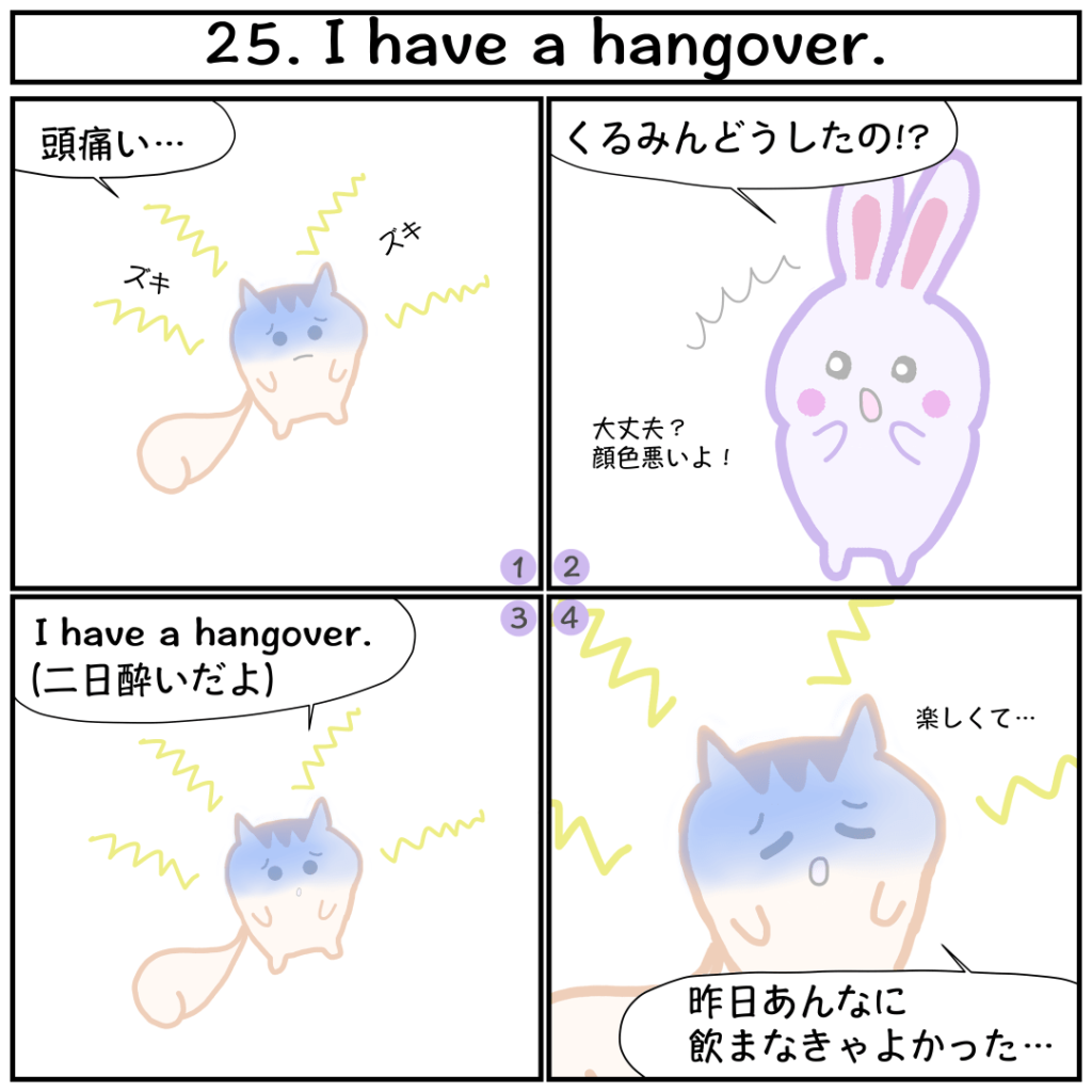 [25]I have a hangover. / 二日酔いです。 2021 1/28 4コマ英語 2021.01.28 2021.01.28 ※当サイトは、アフィリエイト広告を利用しています 4コマ英語 よかったらシェアしてね! URL Copied! URL Copied! 【247】 Your car has a dent here./あなたの車、ココにへこみがあるよ。 <16>pamper 意味と例文 関連記事 [33]I have something great to tell you. /あなたに伝えたいことがあります 2021.02.05 [17]Let’s take a break./休憩しましょう 2021.01.20 [27]Are you in line?/並んでますか? 2021.01.30 [12]I’m just browsing./ただ見ているだけです 2021.01.15 [37]naive/世間知らずな 2021.02.09 [34]What would you recommend?/おすすめは何ですか? 2021.02.06 [8]It doesn’t look good on me./私には似合いません 2021.01.11 <40>I finally did it./やっと出来た 2021.02.24