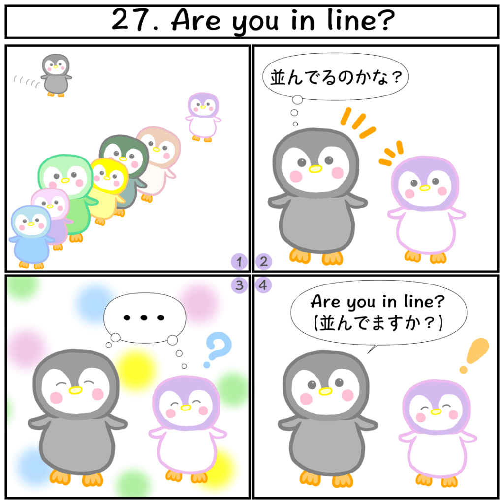 [27]Are you in line?/並んでますか? 2021 1/30 4コマ英語 2021.01.30 ※当サイトは、アフィリエイト広告を利用しています あわせて読みたい【27】Are you in line?/並んでますか?<今日のフレーズ>Are you in line? 4コマ英語 よかったらシェアしてね! URL Copied! URL Copied! <17>flimsy & frenzy 意味と例文 <18>secrete & secret 意味と例文 関連記事 [1]〜would be nice/〜がいいです 2021.01.01 [28]Let me know/教えてね 2021.01.31 [32]Go easy on the mayo, please./マヨネーズ控えめでお願いします 2021.02.04 [21]I’ll leave it (up) to you./あなたに任せるよ 2021.01.24 [16]BOGO/Buy One Get One 2021.01.19 [3]in a minute/すぐに 2021.01.05 [13]Do you have this in a smaller size?/小さいサイズはありますか? 2021.01.16 [4]cut 〜 into three pieces/〜を3個に切り分ける 2021.01.06