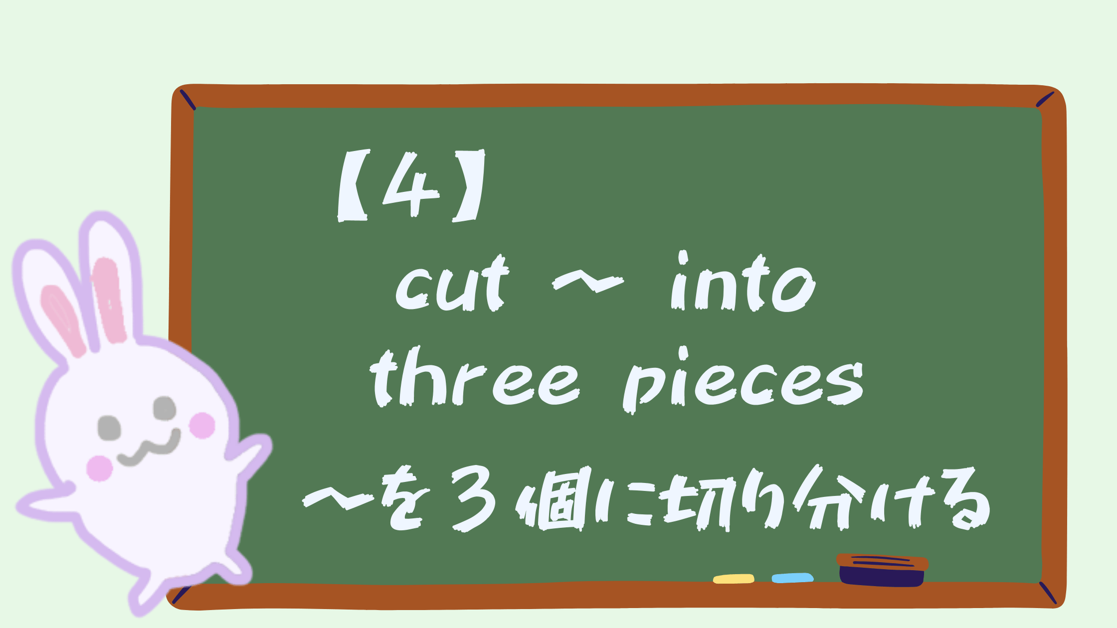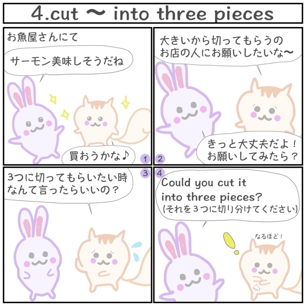 [4]cut 〜 into three pieces/〜を3個に切り分ける 2021 1/06 4コマ英語 2021.01.06 2021.01.28 ※当サイトは、アフィリエイト広告を利用しています あわせて読みたい【4】cut 〜 into three pieces/〜を3個に切り分ける<今日のフレーズ>Could you cut it into three pieces? 4コマ英語 よかったらシェアしてね! URL Copied! URL Copied! 【231】Let's check out./お会計をしよう。 【232】Do you need a plastic bag?/ビニール袋はいりますか? 関連記事 [8]It doesn’t look good on me./私には似合いません 2021.01.11 [29]Are there nuts in this?/これにナッツは入っていますか? 2021.02.01 [32]Go easy on the mayo, please./マヨネーズ控えめでお願いします 2021.02.04 [19]That’s a steal./激安だね 2021.01.22 [24]I should have〜/〜しておけばよかった 2021.01.27 [16]BOGO/Buy One Get One 2021.01.19 [36]Can I have the dressing on the side?/ドレッシングは別添えでお願いします。 2021.02.08 <40>I finally did it./やっと出来た 2021.02.24