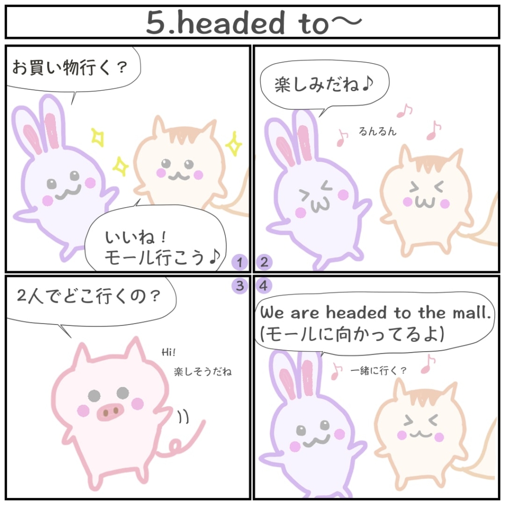 [5]headed to〜/〜に向かう 2021 1/07 4コマ英語 2021.01.07 2021.01.28 ※当サイトは、アフィリエイト広告を利用しています あわせて読みたい【5】headed to〜/〜に向かう<今日のレッスン>We are headed to the mall after the lesson. 4コマ英語 よかったらシェアしてね! URL Copied! URL Copied! 【232】Do you need a plastic bag?/ビニール袋はいりますか? 【233】Please insert your card here./ここにカードを挿入してください。 関連記事 [12]I’m just browsing./ただ見ているだけです 2021.01.15 [15]I’ll take it./これにします 2021.01.18 [25]I have a hangover. / 二日酔いです。 2021.01.28 [20]It’s pricey./値段が高いです 2021.01.23 [8]It doesn’t look good on me./私には似合いません 2021.01.11 <40>I finally did it./やっと出来た 2021.02.24 [35]Does this come with a salad? /これにサラダはついていますか? 2021.02.07 [27]Are you in line?/並んでますか? 2021.01.30