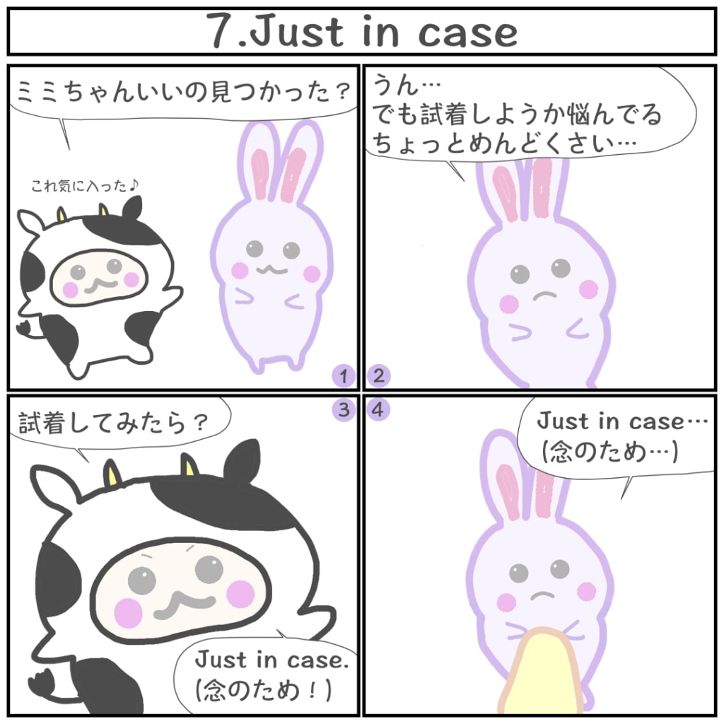 [7]just in case/念のため 2021 1/10 4コマ英語 2021.01.10 2021.01.28 ※当サイトは、アフィリエイト広告を利用しています あわせて読みたい【7】just in case/念のため<今日のフレーズ>just in case 4コマ英語 よかったらシェアしてね! URL Copied! URL Copied! 【234】I hope it goes well./うまくいくように祈っています。 【235】Wish me luck!/うまくいくよう祈ってて! 関連記事 [23]It’s no big deal./大したことじゃないよ 2021.01.26 [19]That’s a steal./激安だね 2021.01.22 [24]I should have〜/〜しておけばよかった 2021.01.27 <39>That would be great./そうしてもらえるとありがたい 2021.02.16 [4]cut 〜 into three pieces/〜を3個に切り分ける 2021.01.06 [21]I’ll leave it (up) to you./あなたに任せるよ 2021.01.24 [20]It’s pricey./値段が高いです 2021.01.23 [27]Are you in line?/並んでますか? 2021.01.30