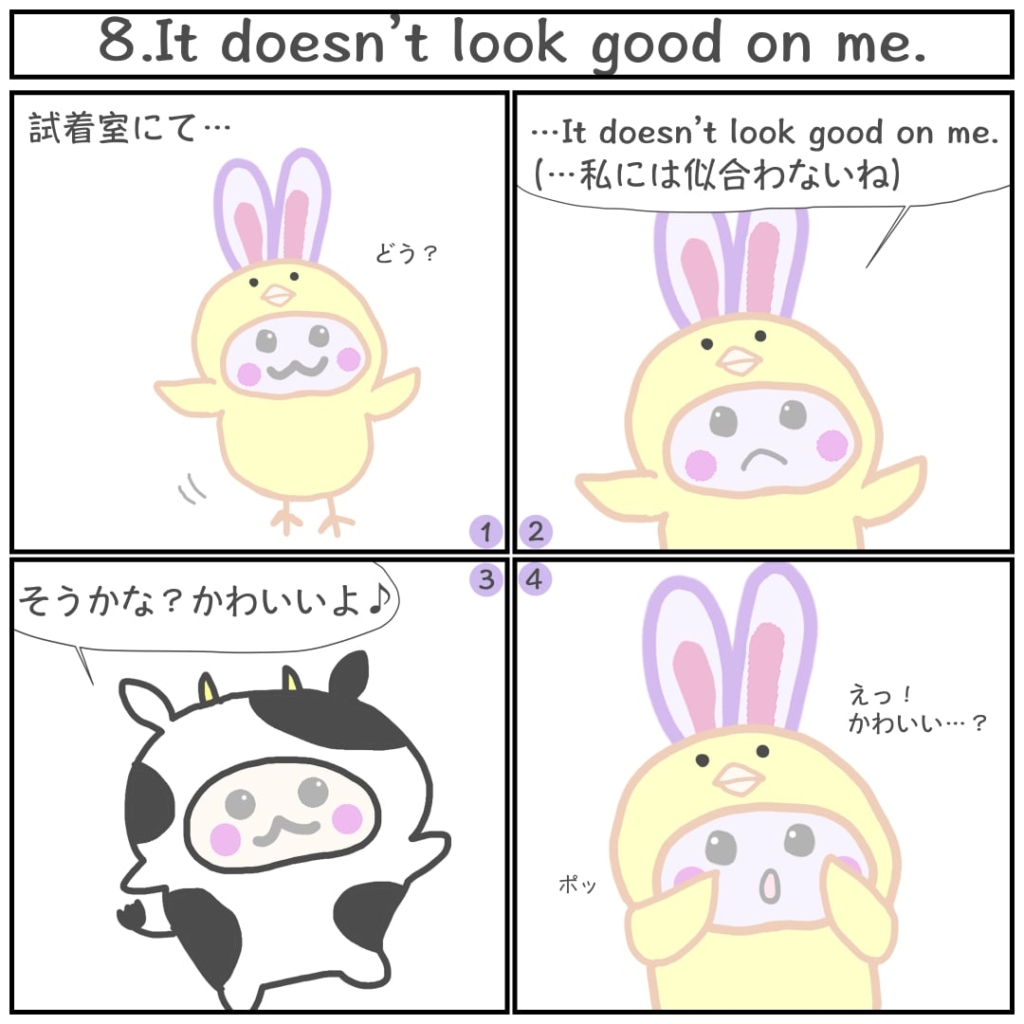 [8]It doesn’t look good on me./私には似合いません 2021 1/11 4コマ英語 2021.01.11 2021.01.28 ※当サイトは、アフィリエイト広告を利用しています あわせて読みたい【8】It doesn’t look good on me./私には似合いません<今日のフレーズ>It doesn’t look good on me. 4コマ英語 よかったらシェアしてね! URL Copied! URL Copied! 【235】Wish me luck!/うまくいくよう祈ってて! 【236】Bless you!/お大事に! 関連記事 <39>That would be great./そうしてもらえるとありがたい 2021.02.16 [4]cut 〜 into three pieces/〜を3個に切り分ける 2021.01.06 [6]Can I try this on ?/試着してもいいですか? 2021.01.08 [32]Go easy on the mayo, please./マヨネーズ控えめでお願いします 2021.02.04 [23]It’s no big deal./大したことじゃないよ 2021.01.26 [5]headed to〜/〜に向かう 2021.01.07 <40>I finally did it./やっと出来た 2021.02.24 [38]It’s just your imagination./気のせいだよ 2021.02.11